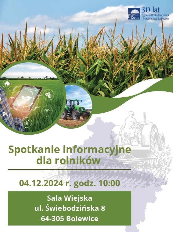 Agencja Restrukturyzacji i Modernizacji Rolnictwa zaprasza na spotkanie informacyjne z rolnikami, które odbędzie się 4 grudnia o godzinie 10:00 na Świetlicy Wiejskiej w Bolewicach.