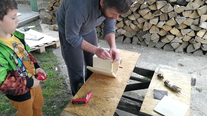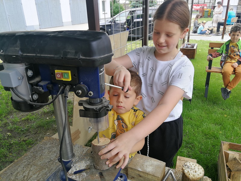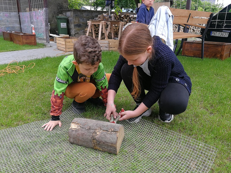 Prace techniczne zaplanowaliśmy oczywiście w naszej Zielonej Czytelni. Warsztaty miały charakter międzypokoleniowy. Warsztat był pomyślany tak, aby każda grupa mogła zbudować domek od podstaw własnymi rękoma. W czytelni pojawiło się mnóstwo narzędzi, metalowe siatki, trzcina, drewno, wkrętarki i różne maszyny do cięcia i wiercenia. Dzieci świetnie sobie radziły, pod okiem starszych, który wykonywali najtrudniejsze prace. Uczyliśmy się ciąć, wiercić, wyżynać, takerować i wkręcać. Gdyby nie instruktorzy można byłoby zakręcić się w całym tym procesie.